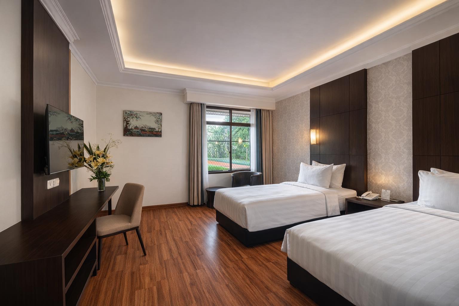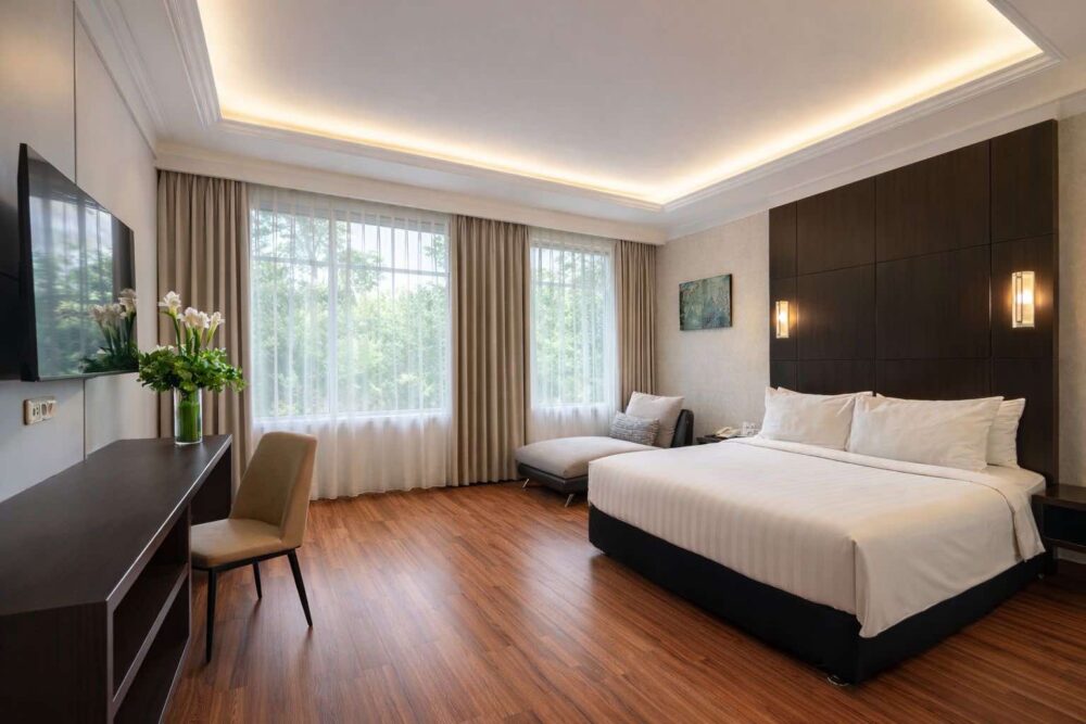 The Deluxe Room offers a spacious and welcoming retreat, thoughtfully designed for families and leisure travellers seeking added comfort. Warm tones, refined details, and elegant furnishings create a soothing atmosphere that invites rest and relaxation.